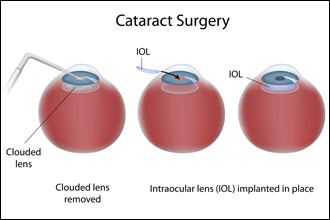 A cataract is a"clouding" of the eye's natural lens, which results in blurred or defocused vision. Cataracts are often described as looking through wax paper or cloudy cellophane. People with cataracts also have color differentiation issues and may not be able to tell the difference between two black socks. In most cases cataract surgery is required where the natural lens is replaced with a man made lens, often referred to as IOL or intraocular lens. This surgery is highly successful and has been drastically improved over the years.